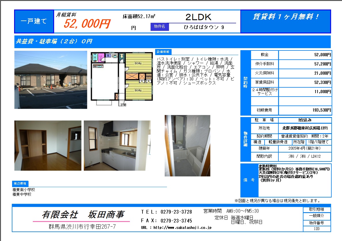 3DK・家賃1ヶ月無料・エアコン・追い焚き・豊秋小学校まで徒歩5分・渋川市役所まで徒歩11分・駐車場2台 |