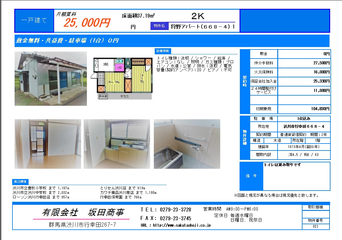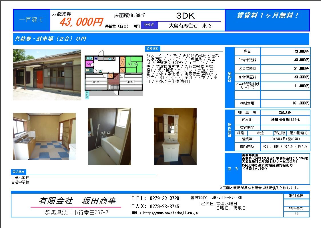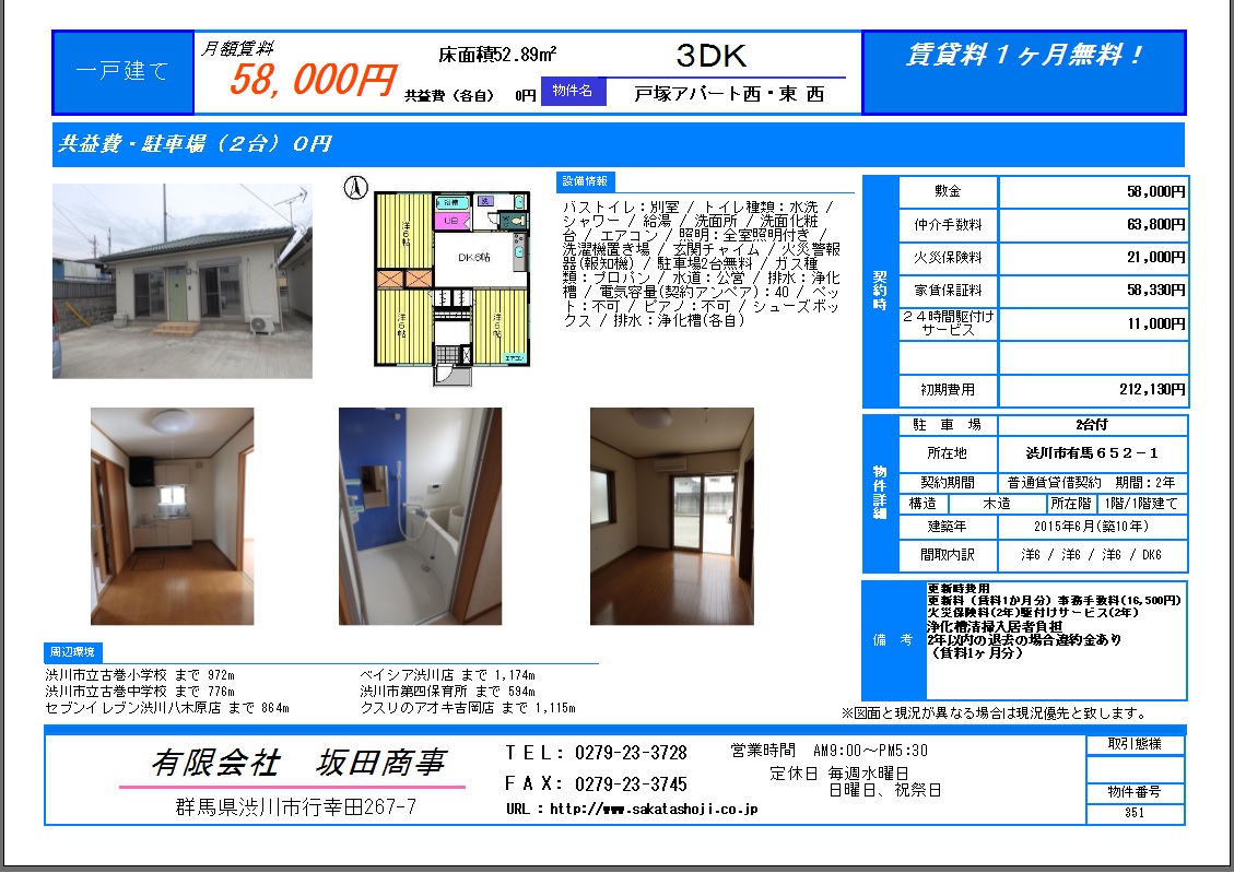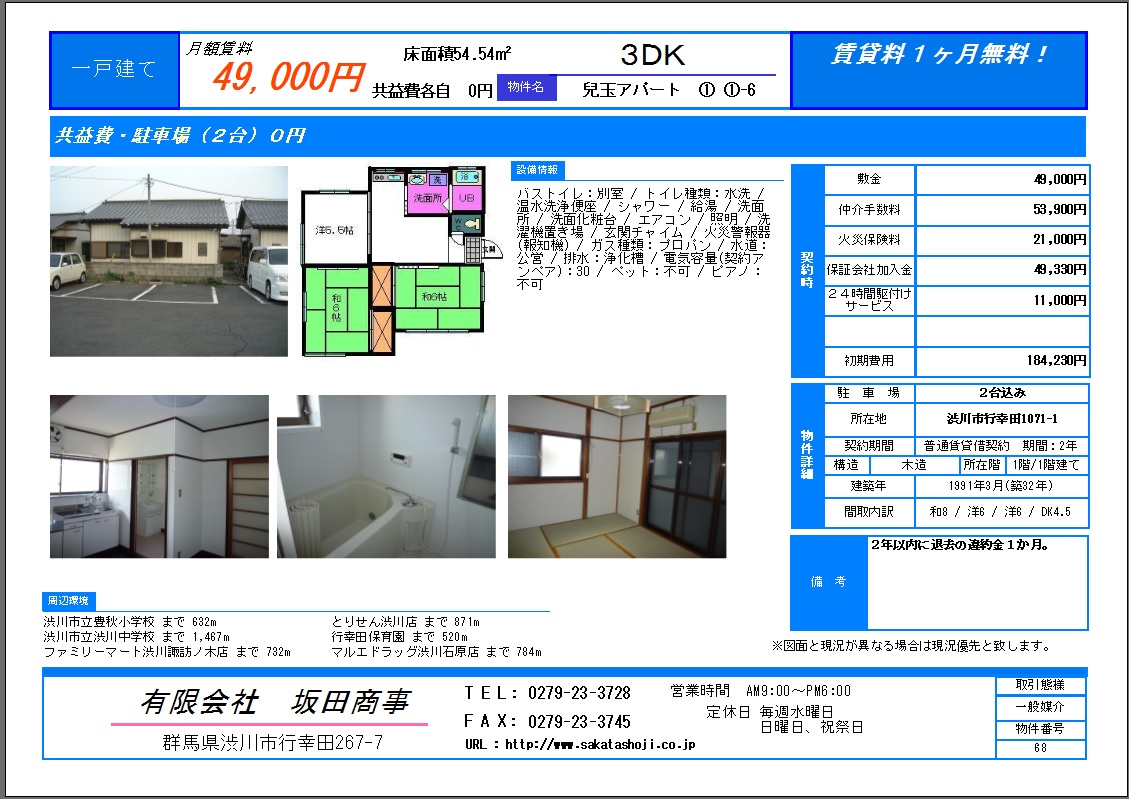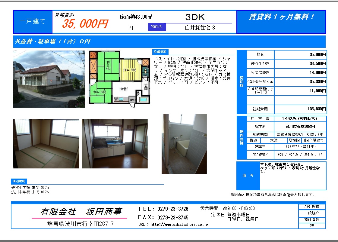 3DK・家賃1ヶ月無料・エアコン・追い焚き・豊秋小学校まで徒歩5分・渋川市役所まで徒歩11分・駐車場2台 |